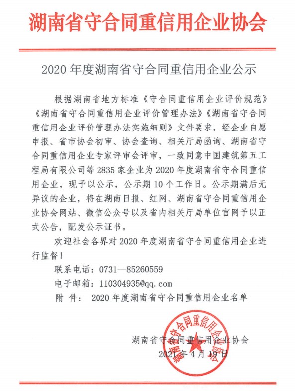 经湖南省守合同重信用企业协会评审,完美网页版设计研究院有限公司荣获2020年度湖南省“守合同重信用企业”称号,这是设计院连续第三年获得此项荣誉。