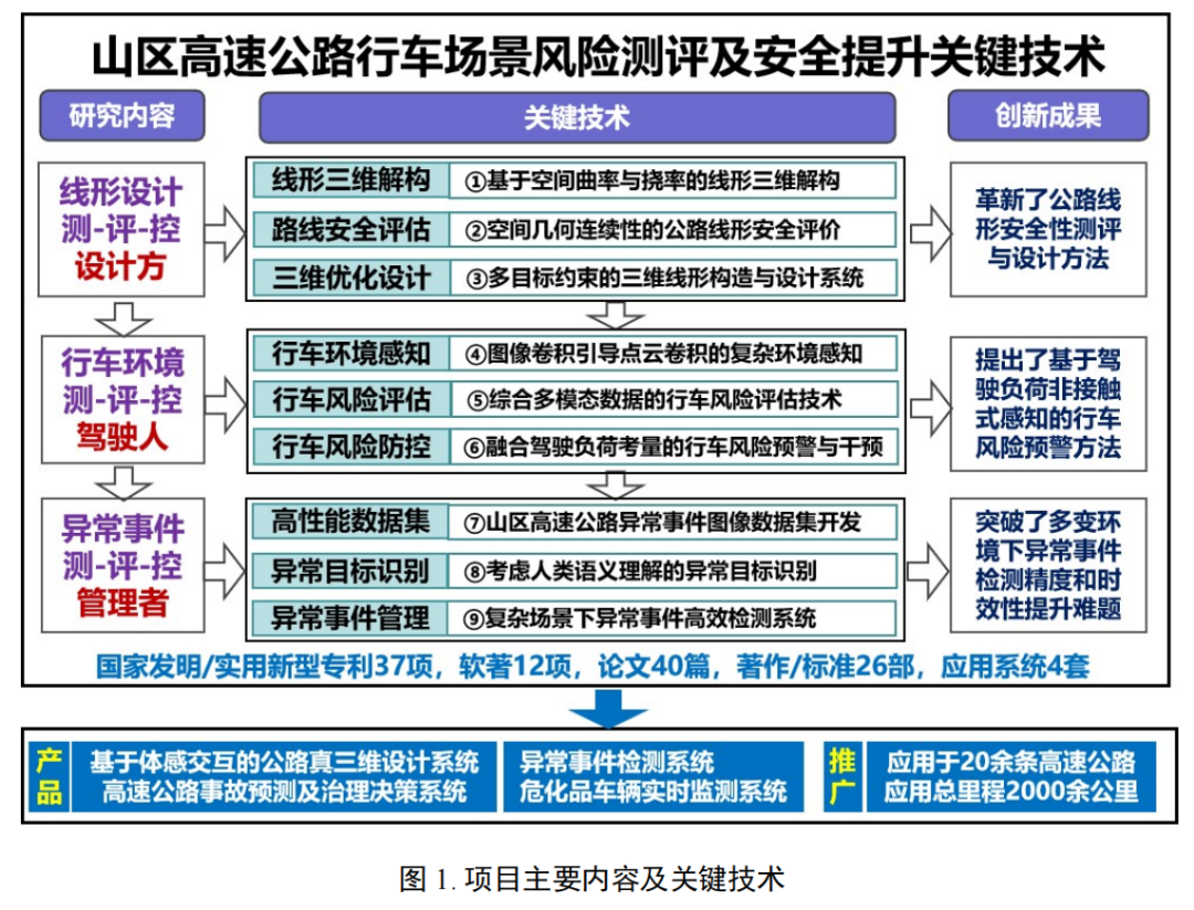 《山区高速公路行车场景风险测评及安全提升关键技术》项目紧扣山区高速复杂多变场景安全提升主题,围绕复杂线形安全性测评与设计、多变道路环境行车风险评估和主动防控、多发异常事件检测与高效处置三个方面展开研究。创新性地回归三维线形本质,革新了公路线形安全性测评与设计方法;创立了行车环境与驾驶负荷的量化关系,提出了基于驾驶负荷非接触式感知技术的行车风险预警新方法;填补了目标识别中计算机“视觉理解”和人类“语义理解”的鸿沟,开发了复杂场景下的异常事件高效检测技术。