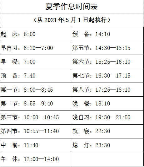 1.夏季作息时间表