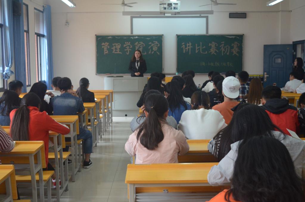 2018年4月1日14:00,管理学院演讲比赛初赛于管理楼307、308正式举行。本次演讲比赛的主题是“知校、爱校、兴校、荣校”,管理学院各班派代表积极参与本次比赛。出席本次比赛的评委有管理学院学生会主席李志俊,学生会主席团叶立梅、颜茁、魏姣姣、刘佳旺、王洛桐,校团委、学生会办公室主任刘林沐,辩论队优秀辩手蒋玉晟、冯茜、姚泽林、杨艳,以及管理学院演讲辩论队副队长周书婷。