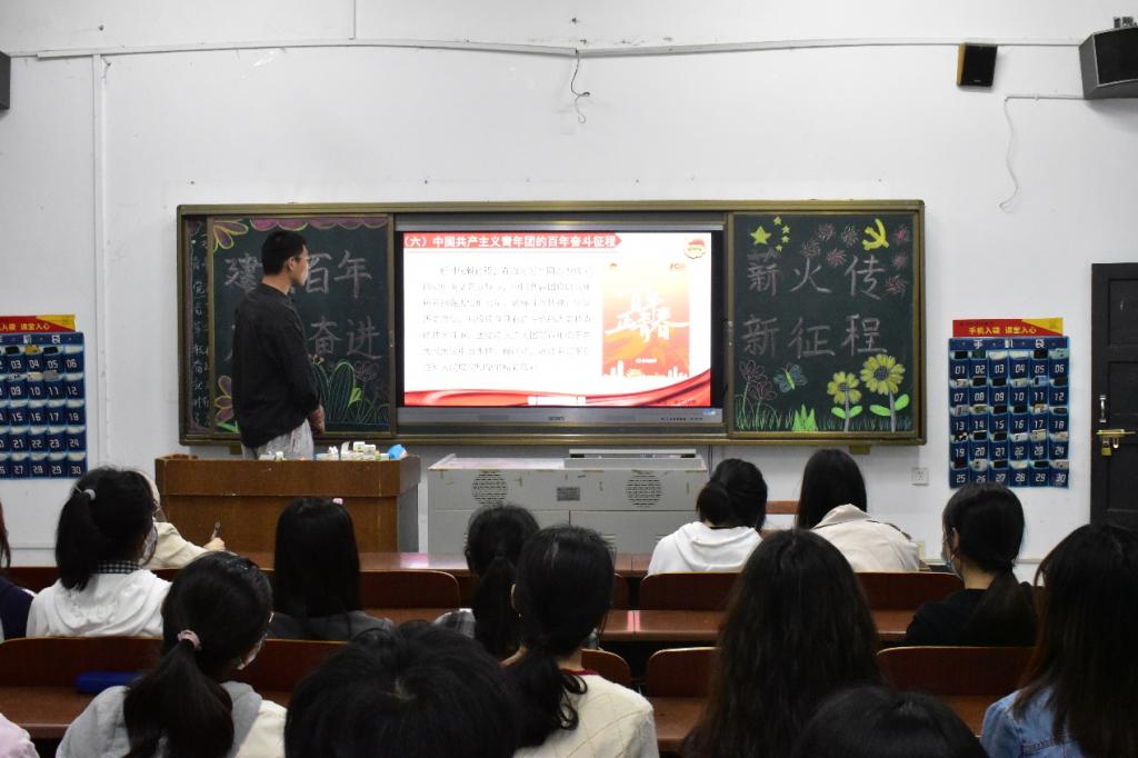 第一部分:百年征程,书学篇章。1923年10月20日,在上海淡水路,中国社会主义青年团机关刊物《中国青年》杂志横空出世。在百年奋斗历程中,共青团始终坚持党旗所指就是团旗所向,围绕党在不同历史时期的中心任务作出了应有贡献、彰显了青春风貌。习近平总书记也在庆祝中国共产主义青年团成立100周年大会上发表了重要讲话。第二部分:寄语青春,不负韶华。在五四青年节即将到来之际,习近平总书记在4月25日上午来到中国人民大学考察调研。习近平总书记强调,“广大青年要做社会主义核心价值观的坚定信仰者、积极传播者、模范践行者,向英雄学习、向前辈学习、向榜样学习。习近平总书记也在5月2日给中国航天科技集团空间站建造青年团队回信,向航天战线全体青年致以节日的祝贺,并向他们提出殷切期望。“少年强则国强”,科学精神或许也没大家想象的那般遥远。身为新时代大学生的我们可以学习优秀作品的科创精神,积极投入到一系列的大学生创新创业比赛中去。第四部分:芸芸学子,求真务实。廉洁教育、法制教育和诚信教育有利于在大学校园环境中形成良好风尚和文化氛围。作为当代大学生,应当树立正确的世界观、人生观、价值观。最后,各班级团支书组织班级同学观看了视频《烟火里的中国》。