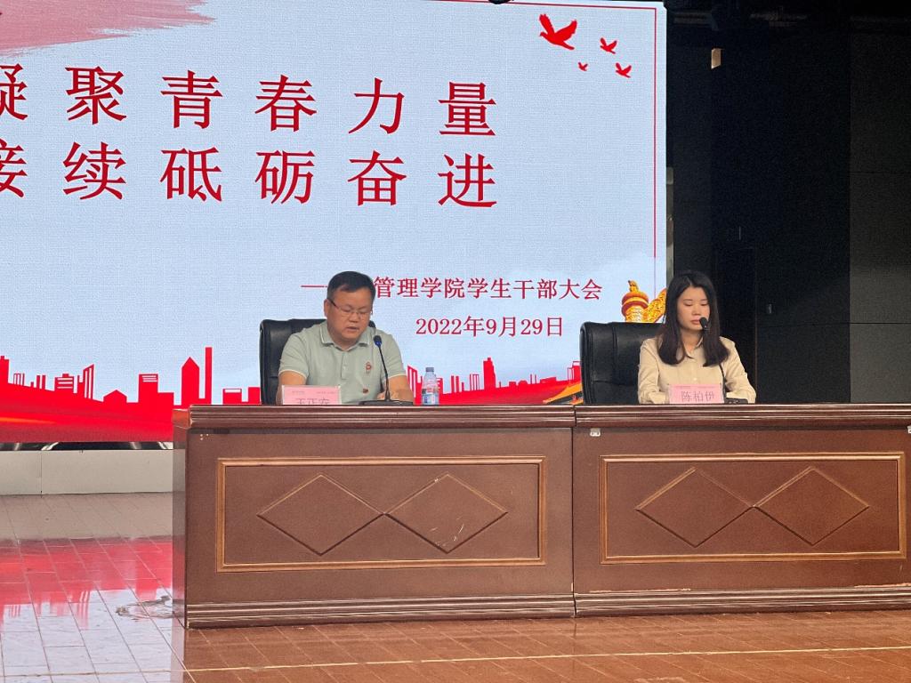 管理学院学生干部大会于9月29日下午14:00在学生活动中心召开,大会由学工办助理李曦主持。管理学院党委书记王正安老师、管理学院全体辅导员、全体团学生会干部、各班班长及团支书参加会议。