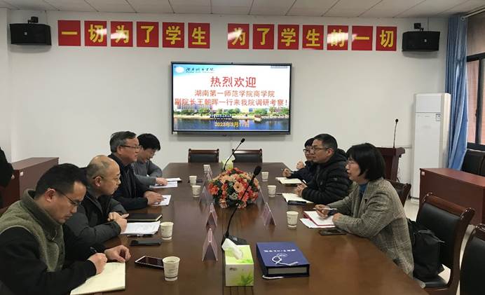 3月17日,湖南第一师范商学院副院长(主持工作)王朝晖、国贸系主任孟娟、旅游管理系主任彭小舟一行来管理学院考察交流,我院党委书记王正安、院长孙倩热情接待了王朝晖院长一行。在随后召开的座谈会上,刘刚副院长和任国平副院长分别介绍了我院在日常教学管理、教学成果奖培育、课程思政、科研项目培育、学科建设、硕士点建设等方面的做法和经验,孙倩院长主持座谈会。(通讯员:尹罡)