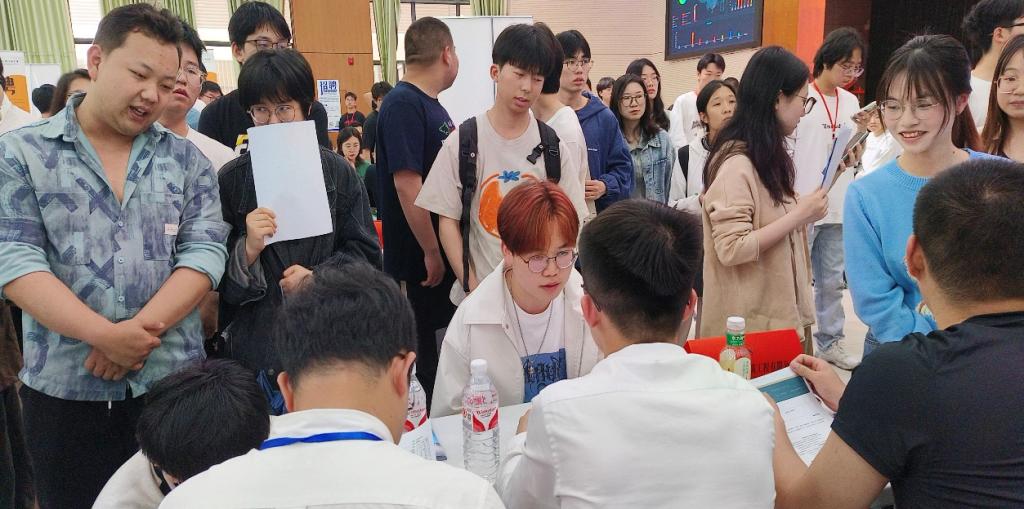 招聘现场“你来我往”。毕业生们积极与用人单位沟通交流,介绍自己的专业优势和岗位期待,并详细咨询用人单位的招聘要求等。招聘人员热情地介绍单位相关情况,并耐心回答学生们的疑问。此外,不少大三年级的学生也来到现场,了解就业形势与实习岗位需求,为将来的求职就业提前做好规划。