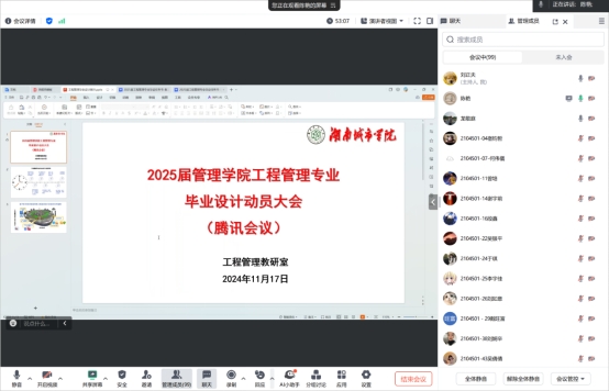 本网讯(通讯员:刘正夫)为扎实推进2025届工程管理专业大四学生的毕业设计工作,帮助学生全面了解毕业设计的重要性、内容规范及实施流程,管理学院工程管理教研室于2024年11月17日组织召开了线上毕业设计动员大会。管理学院党委书记王正安、工程管理教研室主任刘正夫、全体毕业设计指导教师及2021级工程管理专业学生共同参会。会议由刘正夫主任主持。
