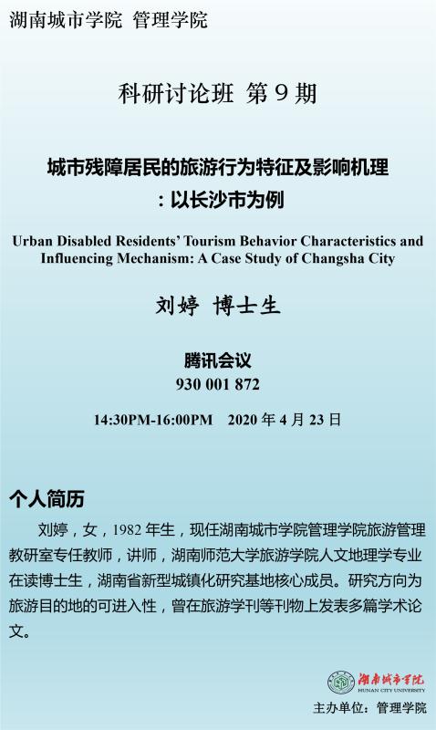【管院科研论坛】09 刘婷:城市残障居民的旅游行为特征及影响机理研究--以长沙市为例