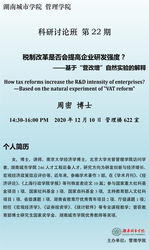 【管院科研论坛】22周密 博士:税制改革是否会提高企业研发成本----基于营改增自然实验的解释