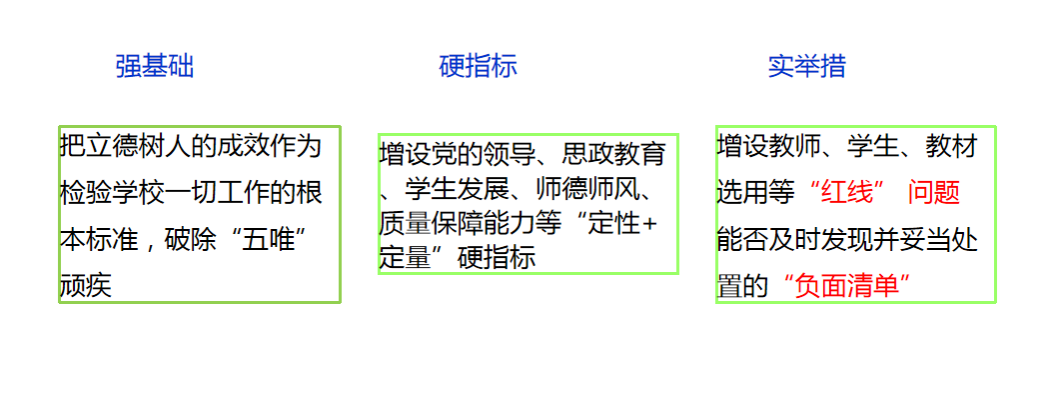一是坚持立德树人。把牢社会主义办学方向,构建以立德树人成效为根本标准的评估体系,加强对学校办学方向、育人过程、学生发展、质量保障体系等方面的审核,引导高校构建“三全育人”新格局。