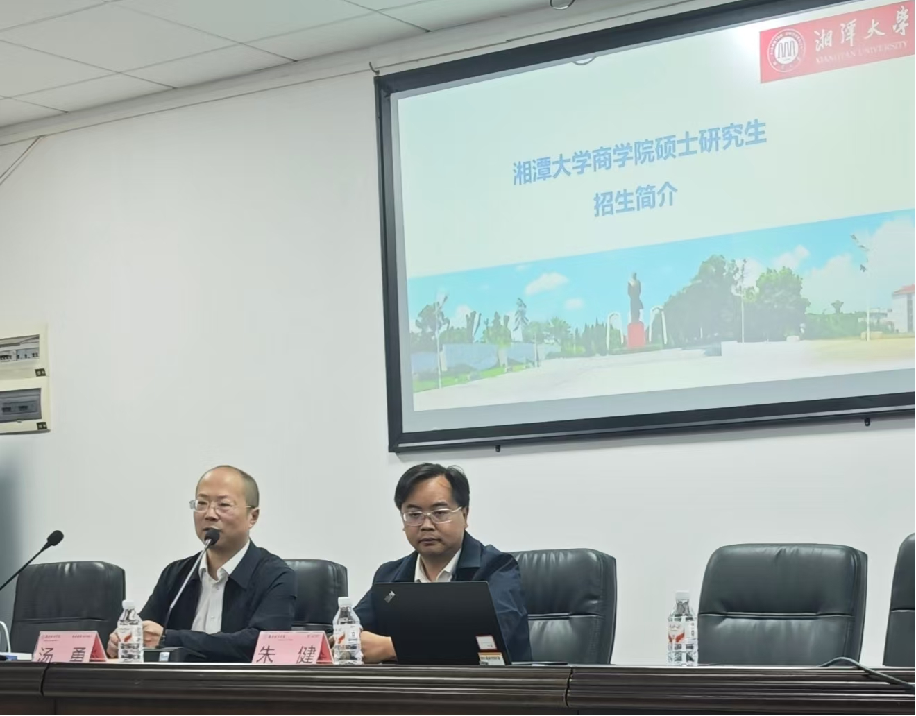 在热烈的掌声中,宣讲会正式进入学院推介环节。湘潭大学商学院副院长朱健教授首先就商学院的研究生招生与培养工作展开介绍。他结合2025年全国考研形势,系统分析了考研对个人发展的重要意义,并围绕目标选择、备考策略、时间规划等方面为同学们提供了详实建议,鼓励大家积极报考湘潭大学商学院。