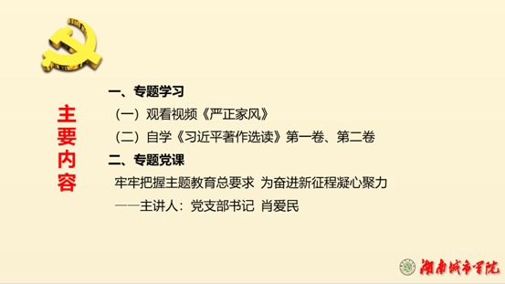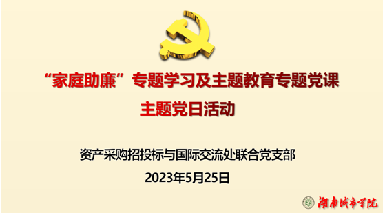 2023525日下午,资产处、采购与招投标管理中心、国际交流处联合党支部在一办公楼131室(支部活动室)开展“家庭助廉”专题学习及支部书记上主题教育专题党课,党支部书记肖爱民主持。
