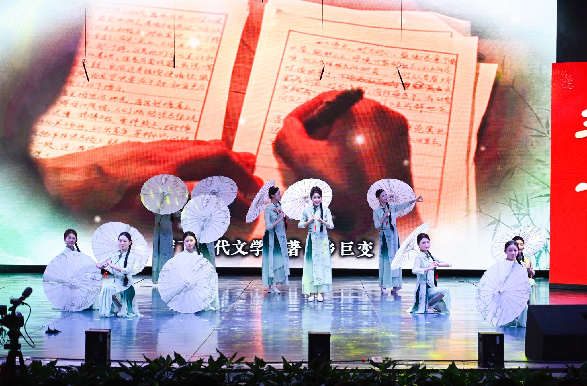 歌曲《山乡巨变》的名字来源于益阳知名作家周立波同名书籍,以资水之畔的益阳为背景,生动唱出了城市日新月异的变化与光明美好的未来;在情景诗《光辉历程》的演绎中,朗诵者声情并茂、抑扬顿挫的朗诵,与别具一格的绘画及书法作品相得益彰,共同绘就了城院55年办学征程中“与时代同频共振”的优异答卷。
